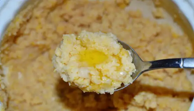 Когда они станут мягкими, кашу нужно посолить. Вода должна впитаться в горох, каша получится полужидкой, но при остывании она загустеет.