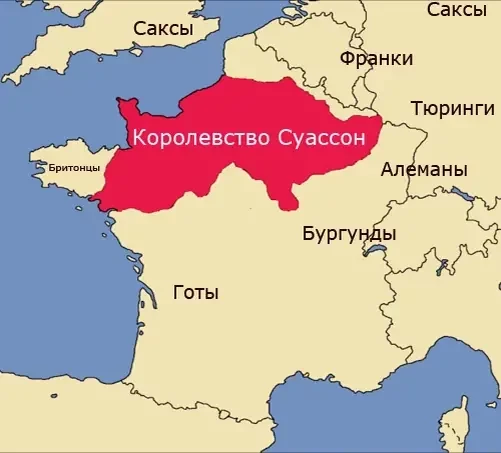 Карта приблизительной площади владений Сиагрия 486 г. н. э. и расселения германских племен. Римский патриций и магистр армии (magister militum), Сиагрий правил на севере Галлии как представитель Римского государства, в то время как сама римская власть на Западе уже пала, упраздненная варваром Одоакром. Поэтому, не провозглашая себя императором и оставаясь римским чиновником, Сиагрий никакому императору не подчинялся — Константинополь находился слишком далеко от Галлии, а связи со столицей империи на Босфоре Сиагрий не поддерживал, так что лишь благодаря его уважению к римским традициям и неприятию сепаратизма его владения юридически оставались частью римского диоцеза. Своей резиденцией Сиагрий выбрал Суассон, расположенный между Парижем и Реймсом…
