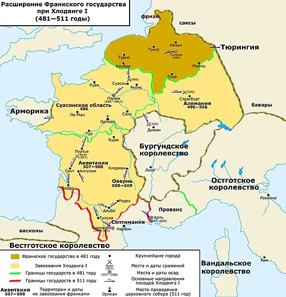 В конце жизни Хлодвигу удалось присоединить к себе ряд мелких варварских «королевств», в результате чего по левому течению Рейна не осталось больше никаких независимых государств, кроме государства франкского.