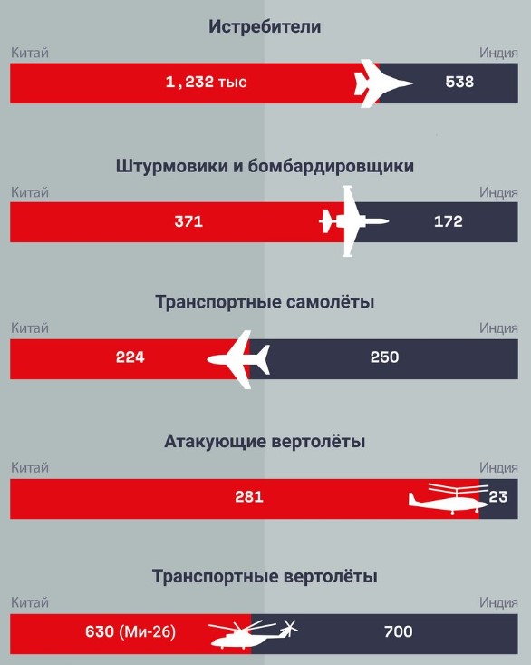 По данным авторитетного рейтинга Global Firepower Index, Китай в рейтинге сильнейших армий мира занимает третье место, Индия - четвёртое место из 137 стран. Рейтинг учитывает данные по сухопутной армии, наземной технике, флоту и авиации.