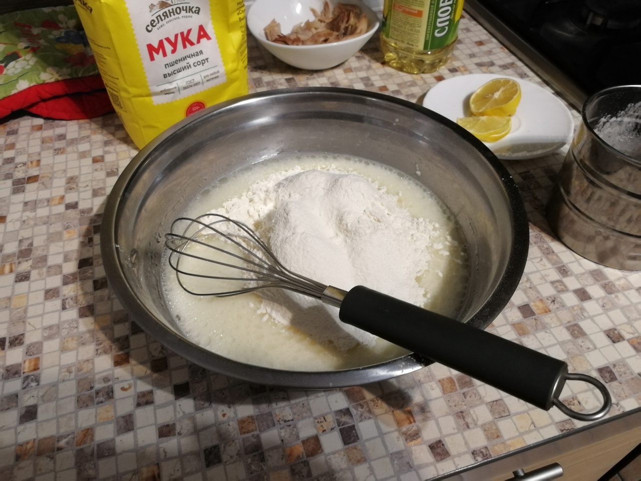 Все, кроме смеси для припека, перемешать до единой смеси. По вкусу можно добавить сахара и лимонного сока. Густота смеси во многом завист от соотношения муки и воды.