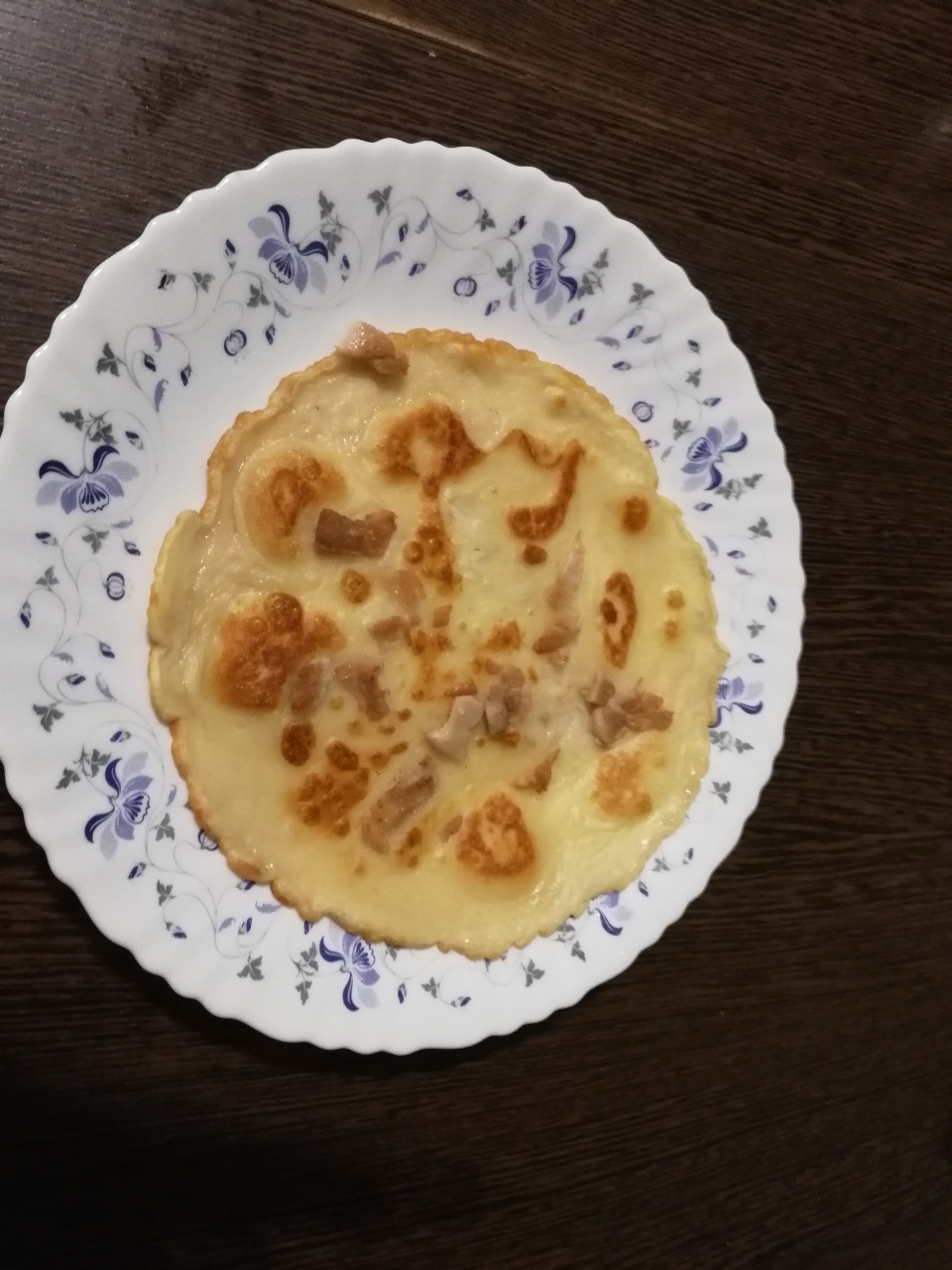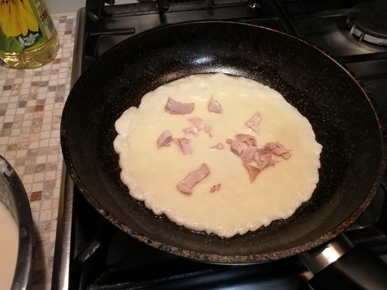 После того как вы зальете ровным тонким слоем на сковороду половник блинной смеси, то не ждите и готовьте ваш припе. Надо раскидать горсть в ладони по сырой поверхности ывашего блина. Ингридиент должен попасть именно в сырую смесь и буквально свариться вместе с блином.