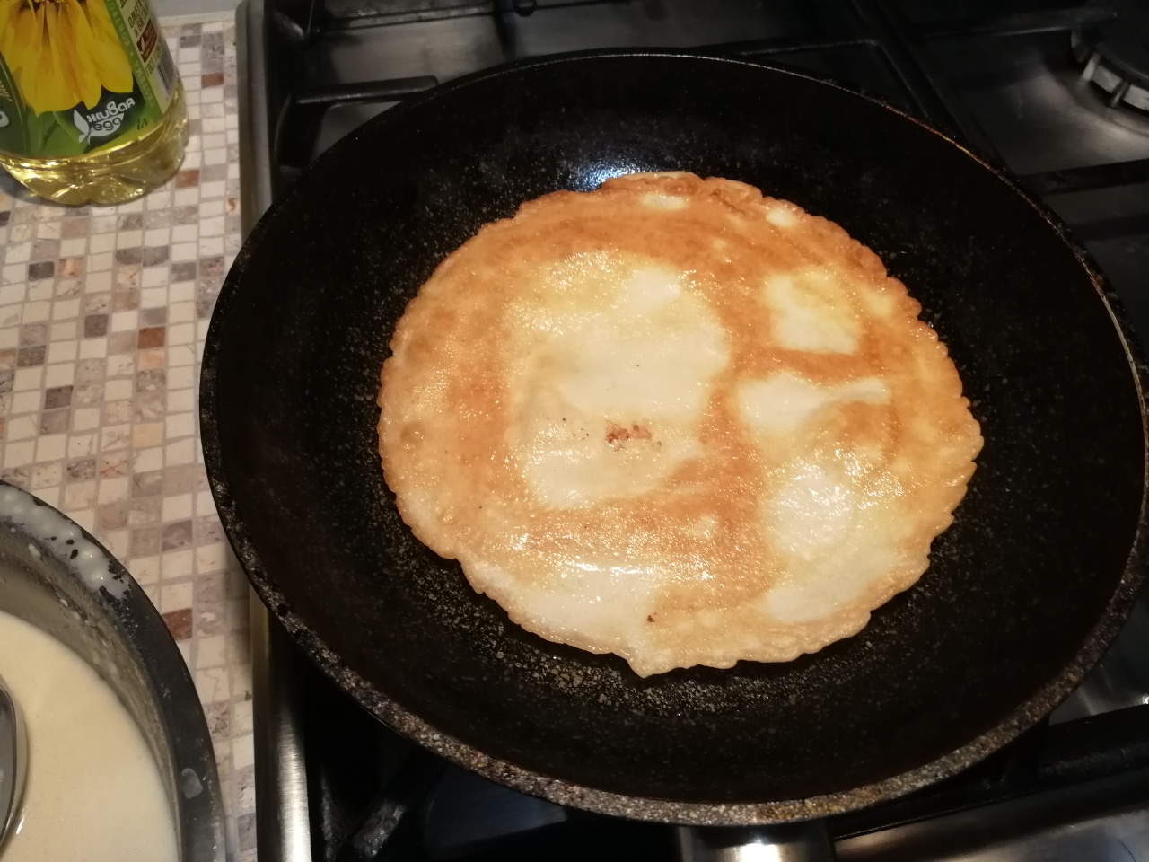 Когда это сделано - можете минуты полторы отдохнуть и подождать когда нижняя часть блина достаточно прожариться. Готовность определите слегка приподнимая ваш блин. Верхняя часть блина при этом приобретет более темный цыет и загустеет. Припек схвачен.