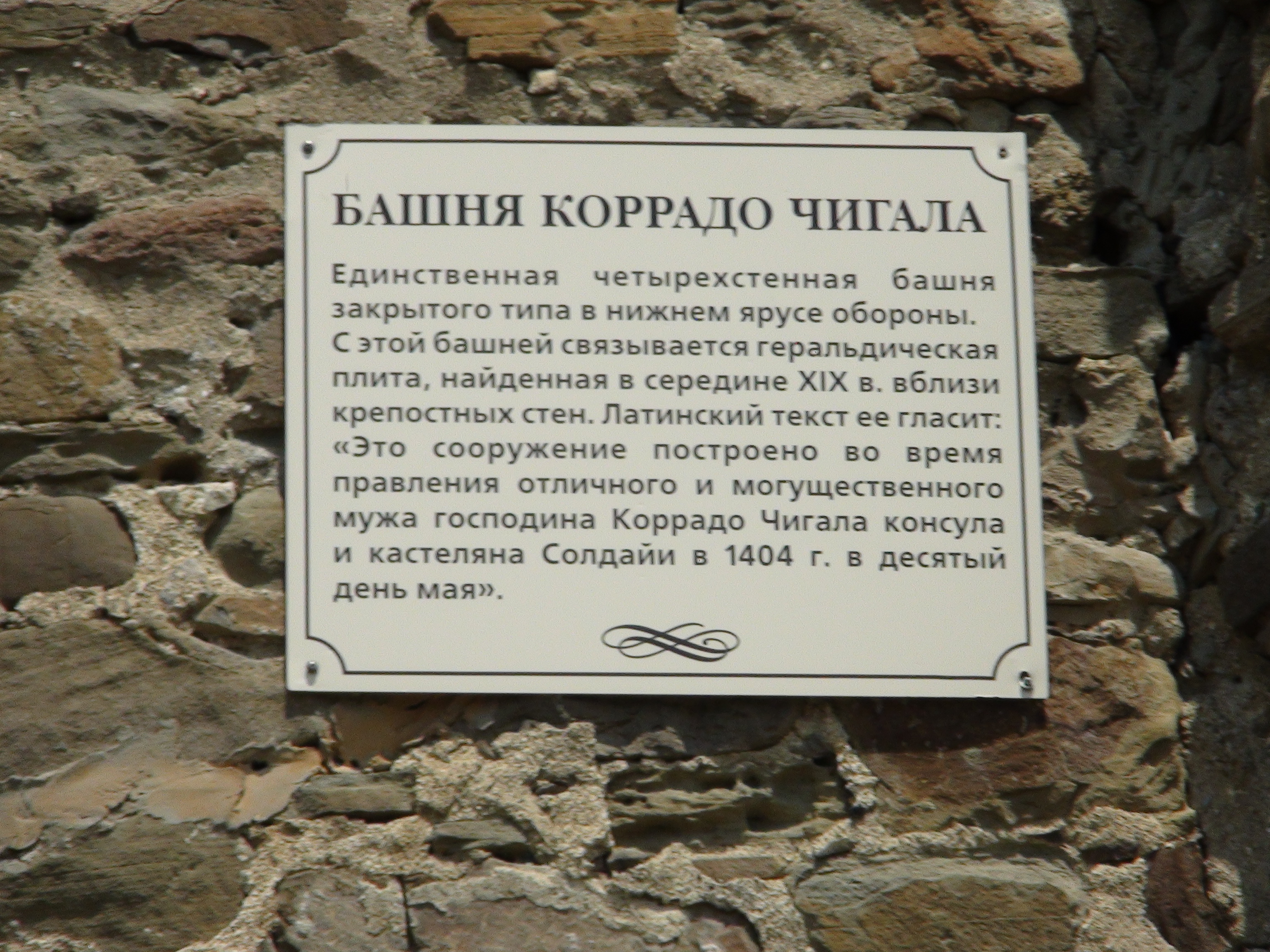 Наиболее интересна среди них башня Коррадо Чигала. Обратите внимание, что это было подтверждено каменной плитой, на которой было отчеканено, что Коррадо Чигала являлся консулом и кастеляном Солдайи (Судака), который вел гражданские (торговые) и военные (безопасность) дела.