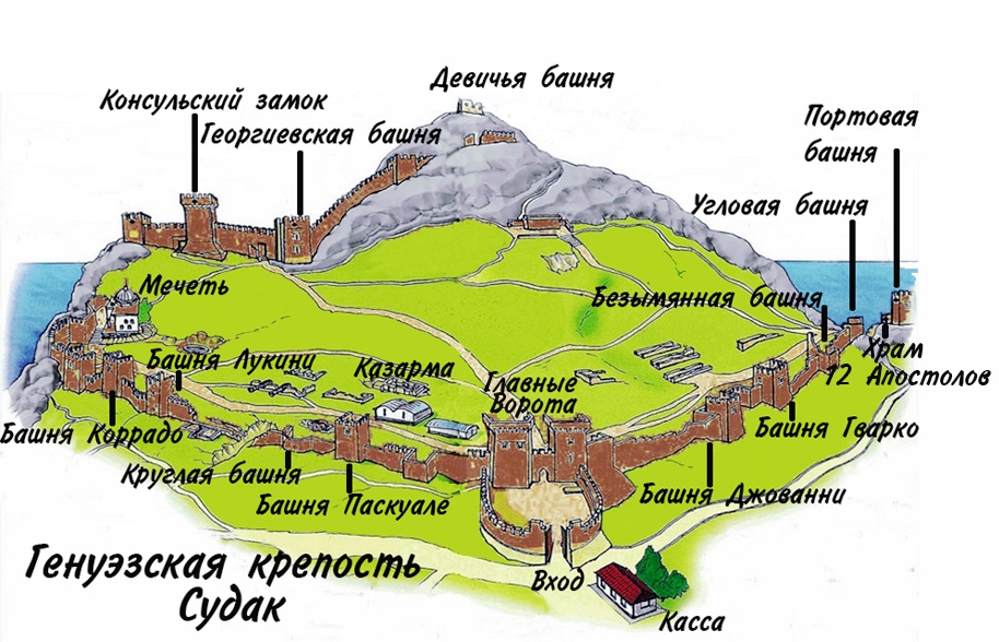 - В 1261 году генузские рыцари оказали помощь византийскому императору Михаилу Палеологу в его войне с Латинянами. Можно сказать они предали своих. Но за это с XIII века генуэзцы получили исключительное право на Босфорский пролив и торговлю в Черном море. Более того, итальянские торговцы получили право на строительство военных крепостей и использования их в своих целях. После этого в городах Кефе (Алушта), Солдайя (Судак) и пригороде Херсонеса (Севастополя) в Балаклаве появляются хорошо укрепленные средневековые крепости. Каждый направляемый на службу в Крым консул оставлял свое имя в виде новой оборонительной башни. Вот так в крепости Судака было отстроено четырнадцать башен.