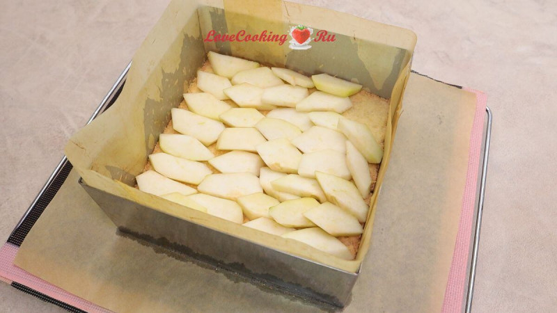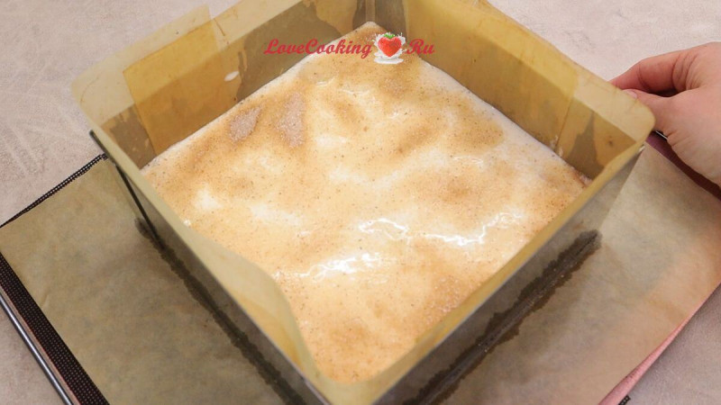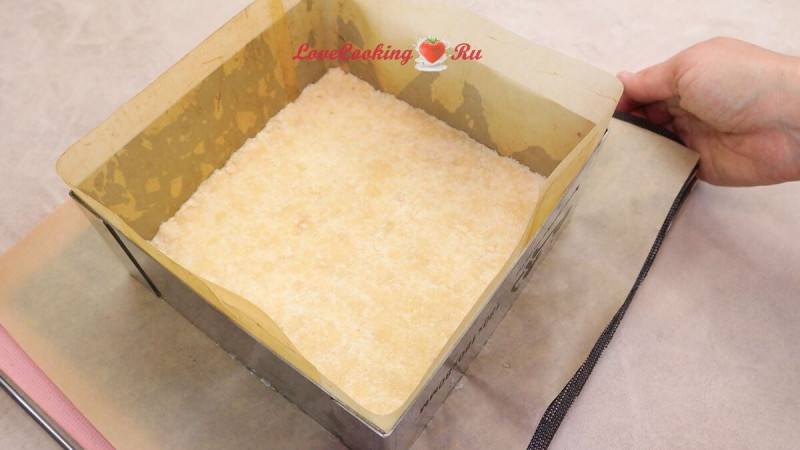 Перекладываем тесто в форму. У меня рамка размером 18х18 см, стенки которой я застелила тефлоновым ковриком. Утрамбовываем крошку.