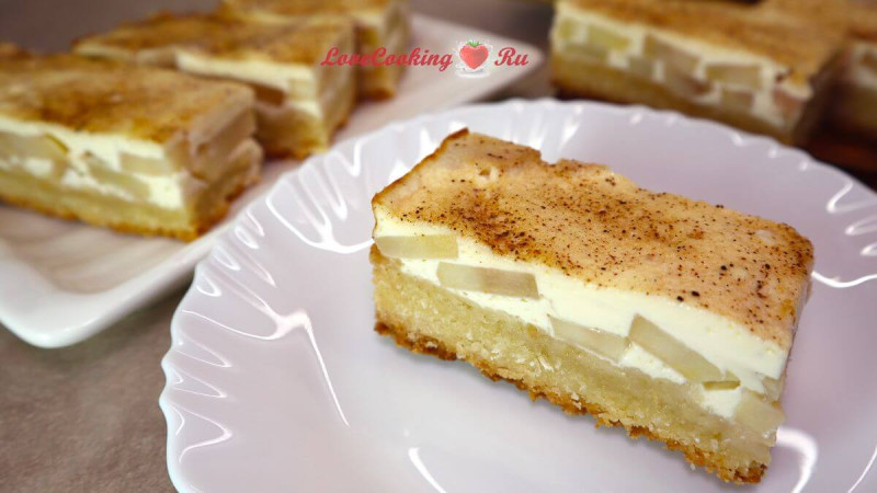 Этот грушевый пирог можно смело отнести к пирожным. Основа по вкусу и текстуре напоминает кокосовое печенье с аппетитной корочкой. Для начинки я выбрала груши, но с яблоками тоже будет очень вкусно. Если хотите, чтобы фрукты сохранили небольшую хрусткость, используйте более твёрдые сорта. Завершает пирог сметанная заливка, присыпанная сахаром с корицей. Подавать этот десерт лучше порционно, нарезав на небольшие пирожные.