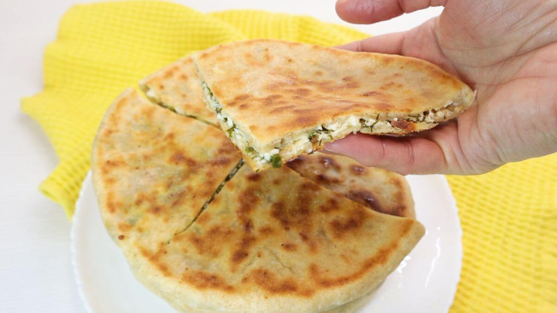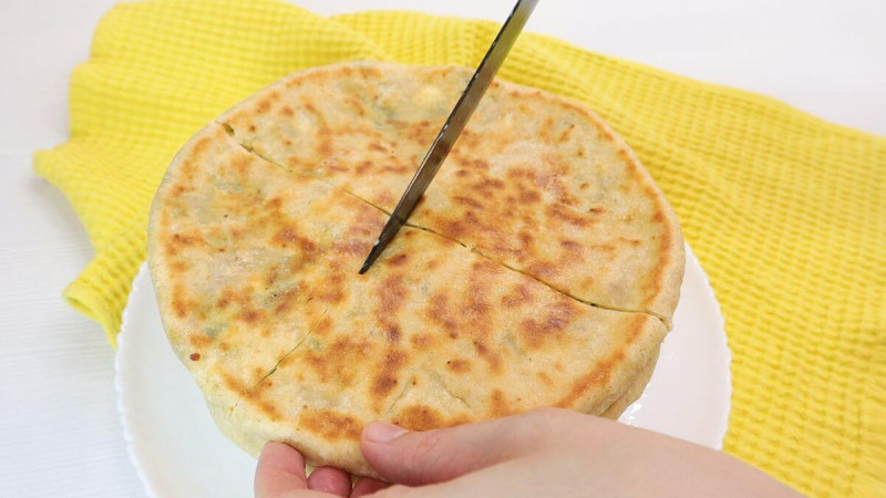 Выкладываем лепёшку на сухую разогретую сковороду. Накрываем крышкой. Жарим с двух сторон на медленном огне примерно по 5 минут с каждой стороны.