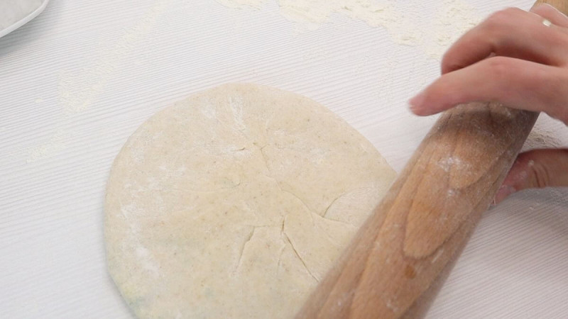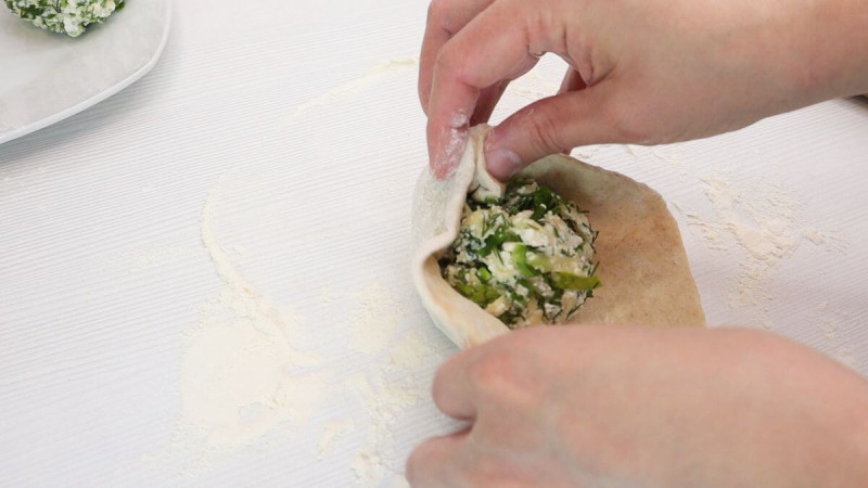 Рабочую поверхность присыпаем мукой. Раскатываем тесто. В середину выкладываем начинку. Собираем тесто к центру, защипывая.