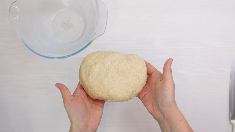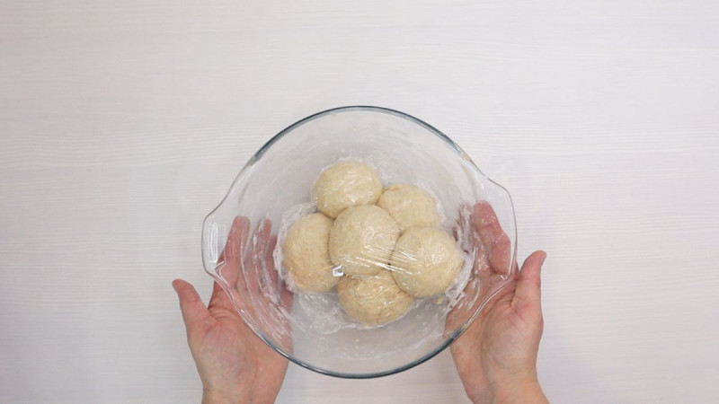 Делим тесто на 6 частей. Скатываем из каждой части шарик. Укладываем в чашу, накрываем плёнкой, даём постоять около 10 минут.