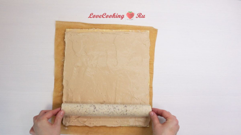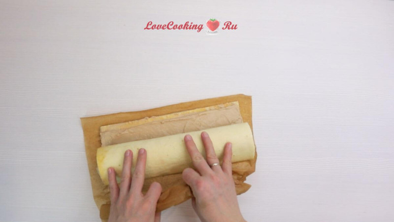 С помощью пергамента сворачиваем бисквит в рулет, хорошо его поджимая.