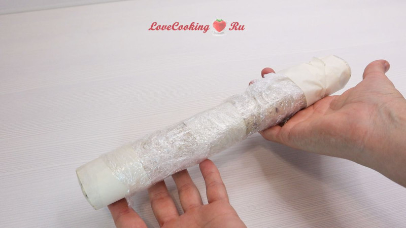 Из ацетатной плёнки делаем трубочку диаметром 3,5 см, длиной 28 см. Один конец хорошо заматываем пищевой плёнкой. Для надёжности я ещё прошлась бумажным скотчем.