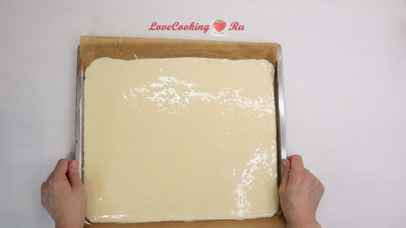 Перекладываем тесто на противень, застеленный пергаментной бумагой.
