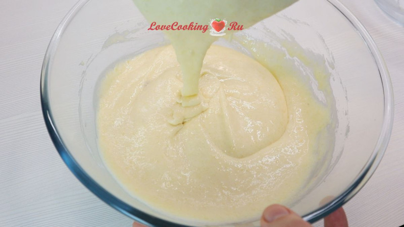 Добавляем немного белковой массы в тесто, перемешиваем лопаткой.