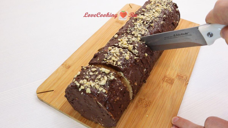 Нарезаем рулет на порции и подаём к столу.