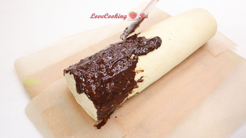 Достаём рулет и покрываем его шоколадным ганашом.
