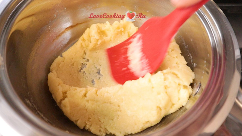 Включаем плиту. Завариваем тесто на среднем огне около 1 минуты, постоянно перемешивая. Необходимо избавиться от лишней влаги в тесте.