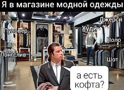 Но полно же ещё всяких разных. Вот, например, «свитшот». Прямо сейчас, пока пишу, я понимаю, что значение этого слова я знаю очень примерно. Что-то типа кофты, скорее всего. А если дословно перевести, получается «свит» - милый, «шот» - выстрел. Что-то странное, но возможно там как-то пишется по-другому, и я неправильно перевёл.