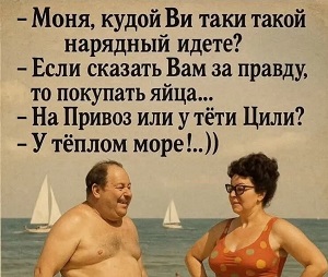 Курортное знакомство. На первый день мужчина гладит женщине руку. На второй — её локоть. На третий, когда он осмеливается тронуть её за плечо, она раздражённо говорит: "Вы думаете, я сюда на полгода приехала?"