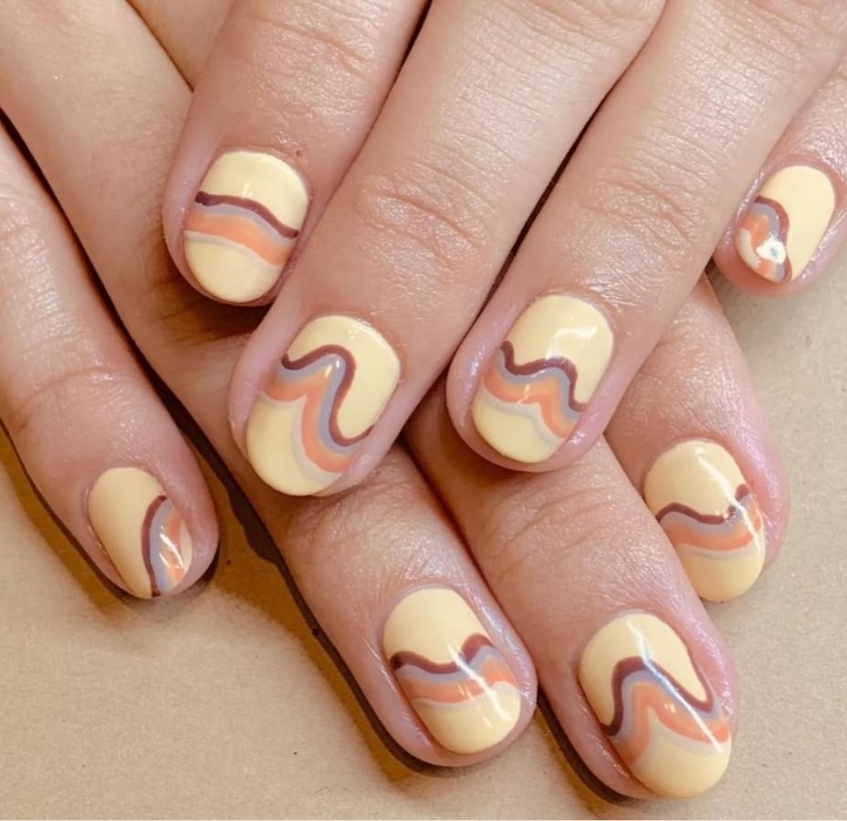 Такой маникюр — из эстетики 1970-х. Дизайн создается с помощью техники мокрого смешивания оттенков прямо на ногтевой пластине.