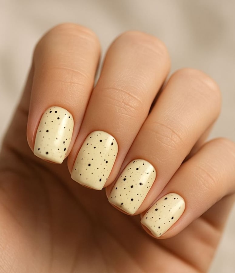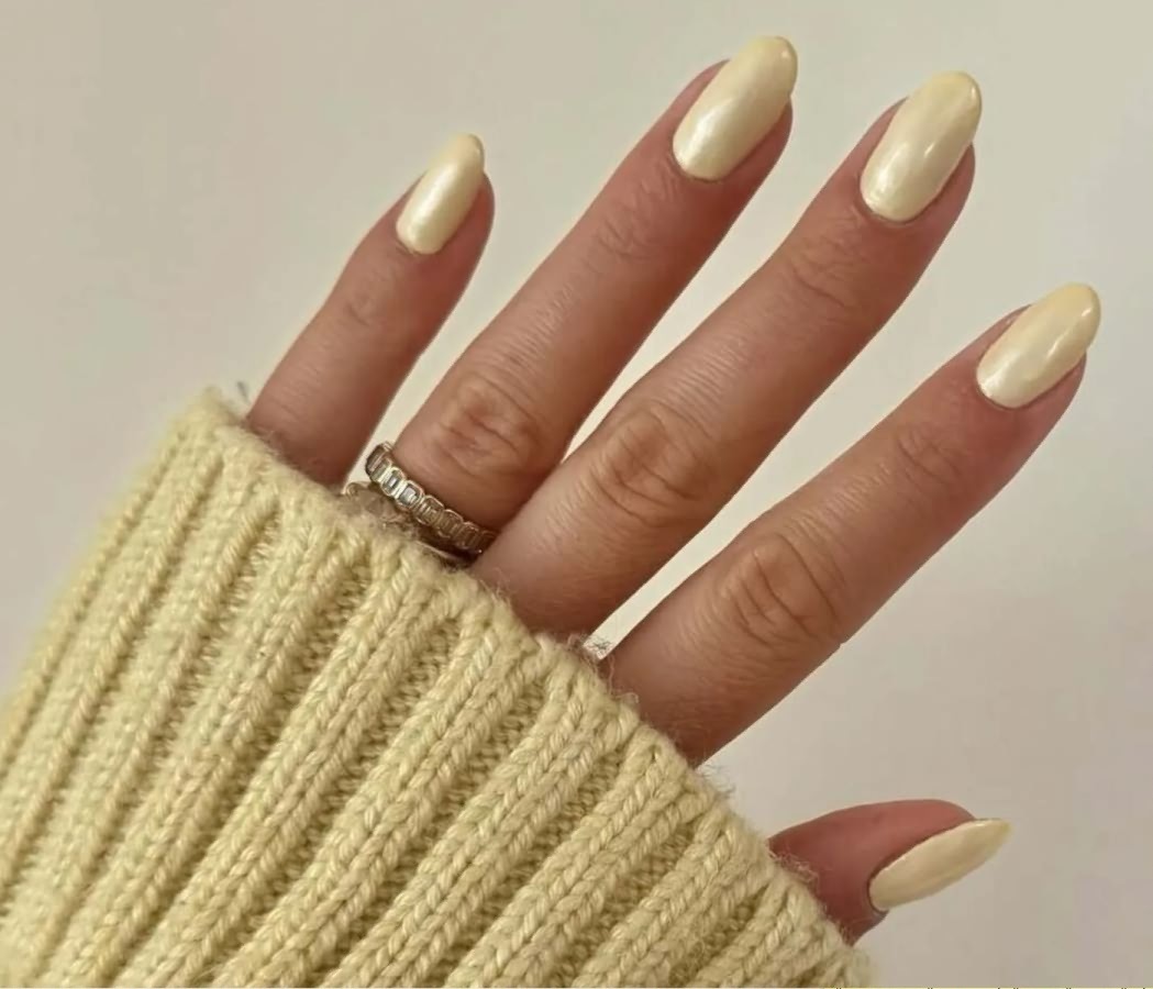 Этот маникюр имитирует нежную лимонную глазурь на пончике. Его секрет в сочетании плотного пастельного оттенка с эффектом мокрого блеска. Мастера используют специальные топы с высокой глянцевостью или перламутровые втирки для создания иллюзии сахарной глазури.