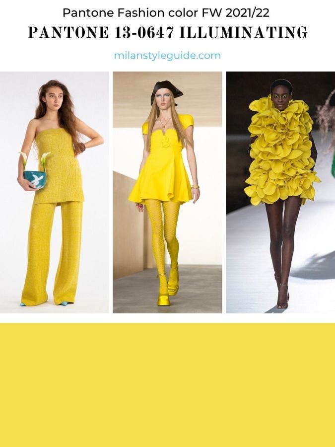 Цвет 2021 года — это светящийся желтый цвет, жизнерадостный и веселый, как солнечный день. Цвет года 2021Pantone Illuminating покорил мир моды. Забавный и жизнерадостный желтый был заметен всех на Неделях моды. Если вы ищете по-настоящему эффектную вещь этого модного цвета обратите внимание на ярко-желтое пальто Prada и Versace.