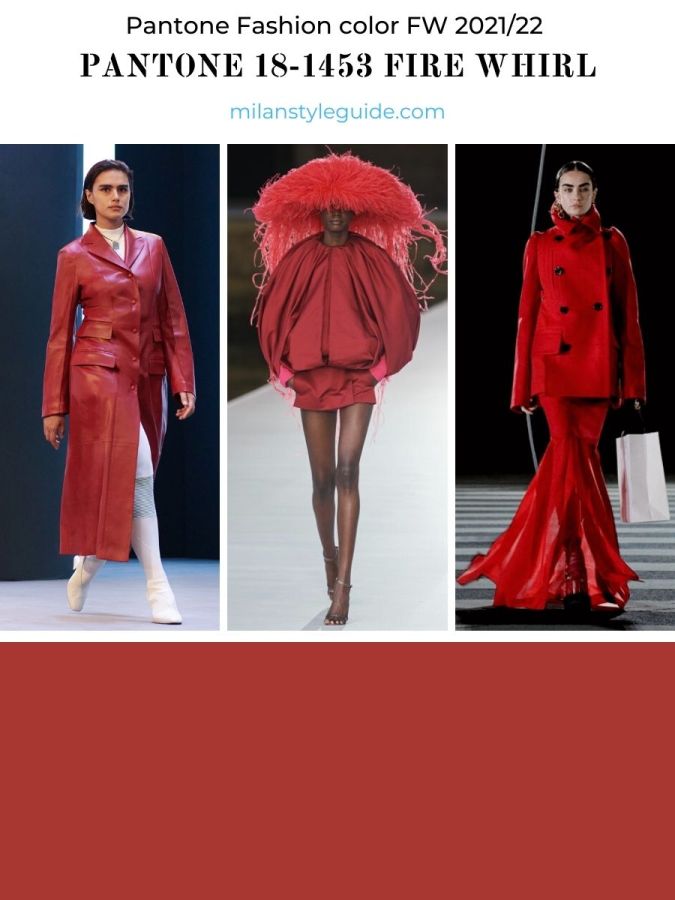 Красный — один из бесспорных модных и трендовых цветов зимнего сезона 2021- 2022 года, его можно было увидеть практически на всех подиумах Недель моды. В Нью-Йорке использовался динамичный красный Fire Whirl. Огненный вихрь Fire Whirl — энергичный пламенный оттенок красного цвета.