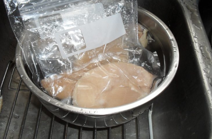 Для быстрой разморозки мяса применяют холодную «водяную баню». Мясо необходимо поместить в герметичный пакет и положить в холодную воду. Вода должна быть именно холодной, поскольку горячая способствует росту бактерий и может местами обварить куски мяса. Чтобы поддерживать нужную температуру, кран оставляют открытым или меняют воду каждые 20-30 минут. Для размораживания в холодной воде небольшим кускам мяса будет достаточно около часа времени, при работе с большими кусками необходимо учесть, что даже такое быстрое размораживание займет несколько часов.