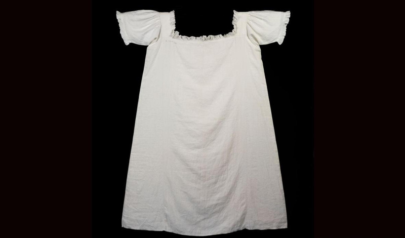 Белое могли себе позволить носить только богачи, поскольку уход за такими вещами был непрост. Чрезвычайно трудоемкий процесс стирки требовал просторных помещений и большого штата прислуги. Вначале вещи замачивали в щелочном растворе, затем их терли и стирали с мылом в горячей воде, затем кипятили в огромных чанах, затем полоскали, крахмалили, отжимали, развешивали для сушки, а затем гладили тяжелыми раскаленными утюгами. Представленная белоснежная сорочка – одна из подобных деликатных вещей, свидетельствующая о высоком статусе владельца.
