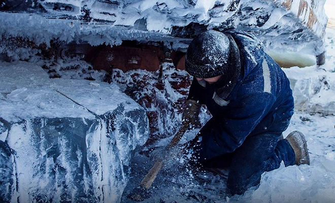 Рабочие, которых здесь зовут выморозчиками, спускаются под застывшие корпуса кораблей и прокапывают тоннели во льду, чтобы добраться до двигателя и винтов. Работают без перерыва, без тепла и часто — без дневного света. Каждый их шаг — риск, ведь лед может треснуть, и тогда путь в ледяную воду открыт.