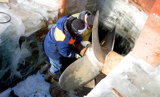 Все начинается с замера толщины льда. Используется специальное буровое устройство, похожее на ледобур, которым измеряют глубину промерзания воды под судном. После этого проводится технический осмотр: проверяется двигатель, рулевой комплекс, оценивается состояние валов. Чтобы подобраться к механизмам, приходится буквально «откапывать» корабль, удаляя лед слоями по несколько сантиметров. За сезон под одним судном вырезают до 180 тонн льда — примерно столько весит взрослый синий кит.