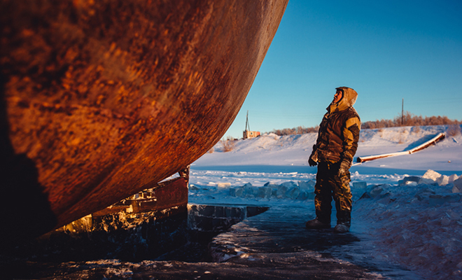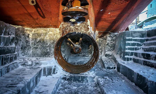 Температура воздуха зимой в этих краях может опускаться до минус шестидесяти. В тоннеле под судном чуть теплее — ледяной ветер сюда не добирается, но работы это не облегчает. Помогает лишь постоянное движение: замерзнуть некогда. Рабочие говорят, что чувство адреналина здесь не покидает ни на минуту.