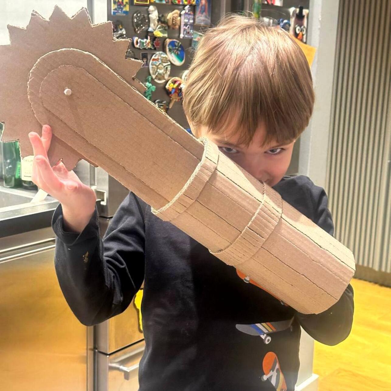 Накануне Матвеев поделился свежим снимком подросшего Гриши, которому скоро исполнится семь лет. На фото ребенок позирует с самодельной игрушкой из картона. Это «оружие» актер сделал своими руками в мастерской, где он проводит много времени. Матвеев начинал с игрушек из дерева, а сейчас, как видно, начал экспериментировать и с другими материалами.