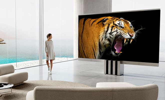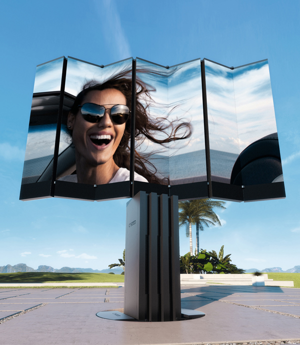 Телевизор разработан австрийской компанией C SEED совместно с дизайнерами Porsche Design Studio. Его фишка — полностью автоматическая конструкция. В неактивном состоянии телевизор скрыт под землей, а при включении поднимается вертикально на семиметровой стойке. Затем экран из семи алюминиевых панелейплавно разворачивается и соединяется в единое полотно диагональю 201 дюйм — это больше, чем у большинства домашних проекторов.