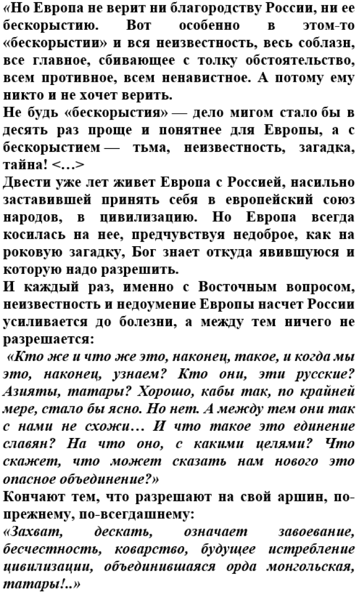 Восточный вопрос Федор Михайлович очень подробно рассмотрел в своем «Дневнике писателя» (1876 г.). Там он объяснял, почему к России на Западе всегда относились враждебно. Стоит заметить для контекста, что Россия тогда стремилась к контролю над Константинополем и единению всех славян. Итак, вот эта довольно большая его цитата: