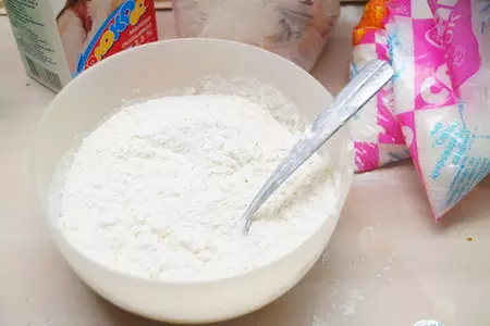 - В глубокую миску просейте муку, посолите, всыпьте сахара и сухих дрожжей.