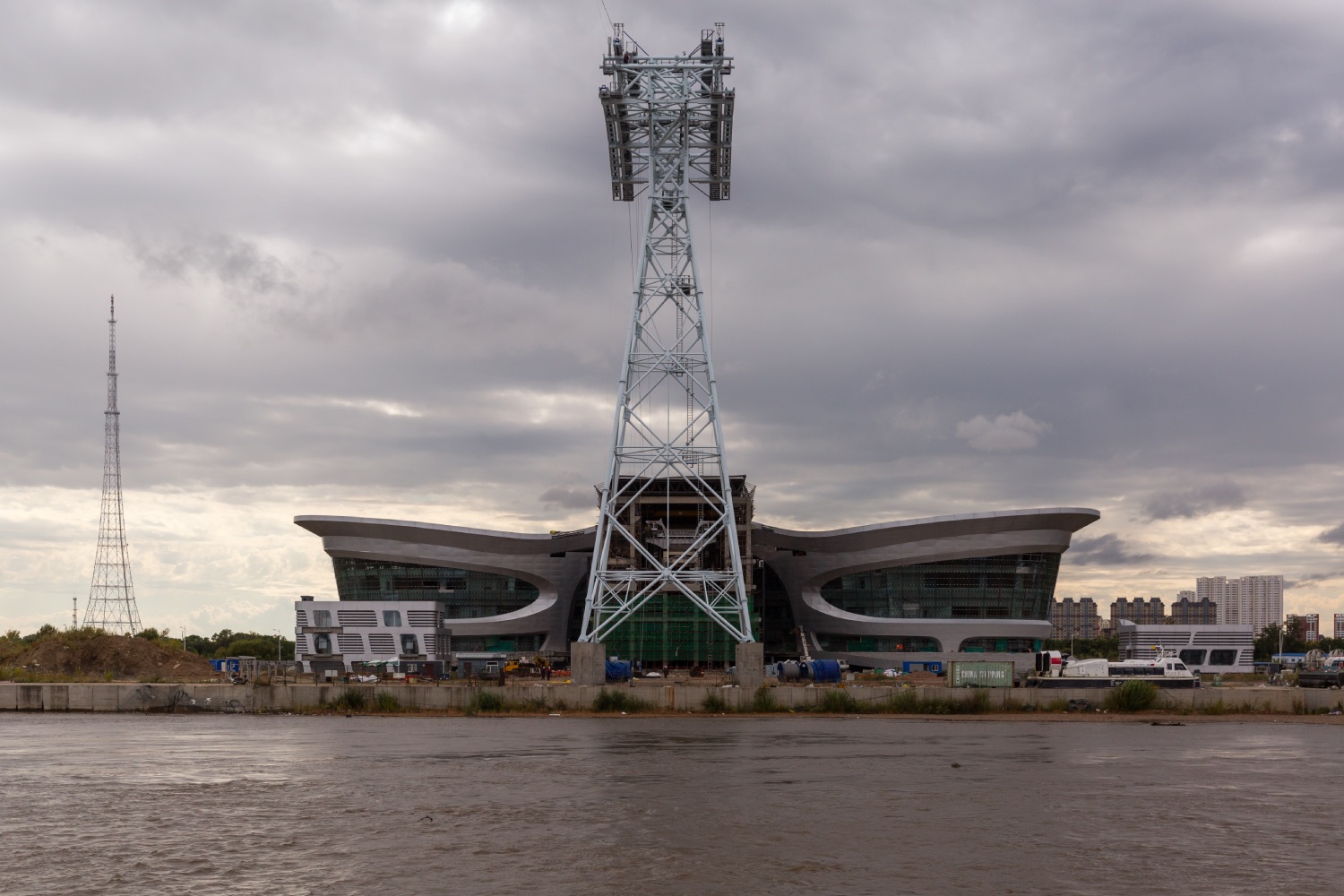 Китайский терминал канатной дороги через Амур полностью готов, в то время как на российской стороне все еще продолжаются отделочные работы.