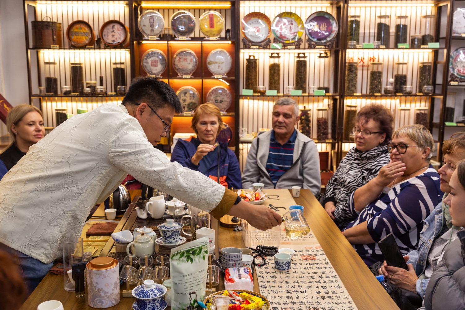 Вэй Хунчжи (Ваня) знакомит российских туристов с тонкостями китайской чайной церемонии.