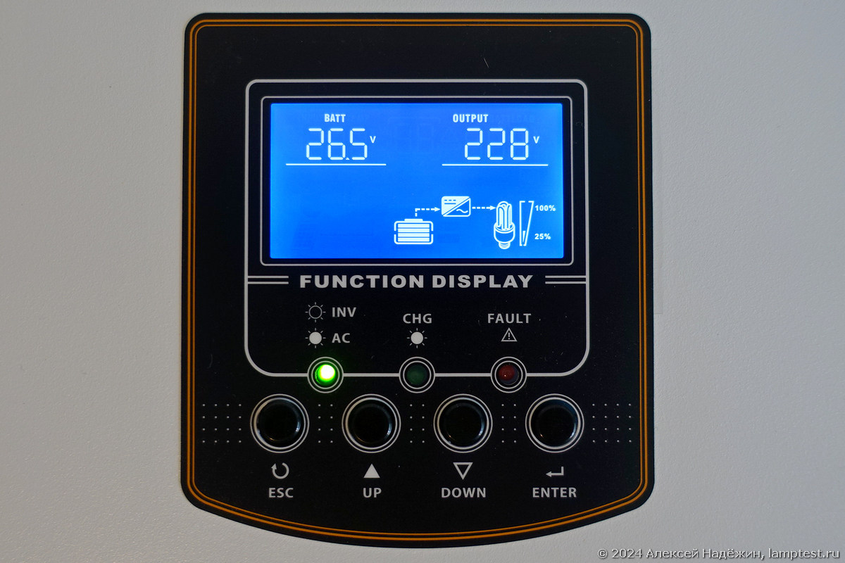 У ИБП множество настроек, при этом по-умолчанию настройки сделаны так, что при использовании AGM-аккумуляторов можно вообще ничего не настраивать (разве что ток зарядки можно снизить с 25 до 15A, но и это необязательно - аккумуляторы выдерживают до 36 ампер). Даже при подключении солнечных панелей можно ничего не настраивать - ИБП просто "почувствует" их появление и начнёт использовать солнечную энергию.