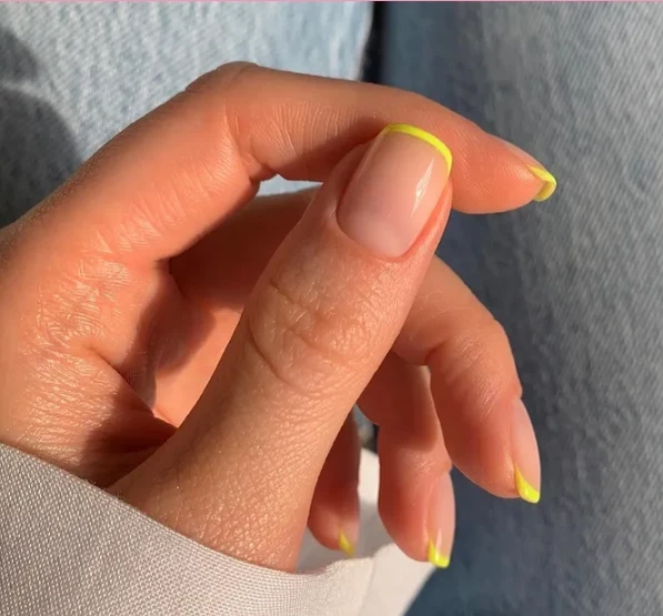 Если ты хочешь что-то легкое и изысканное, микрофренч — идеальный выбор. Этот стиль с тонкими желтыми линиями у края ногтя добавляет нотку игривости и свежести в образ, делая его необычным и одновременно элегантным.