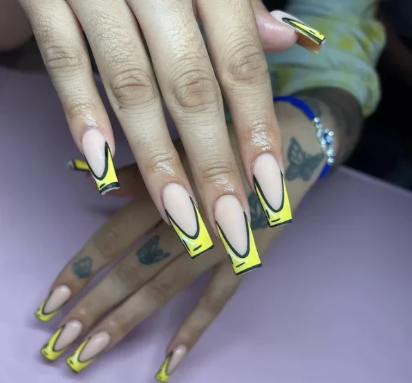 Для тех, кто не боится экспериментов с геометрическими формами, графичный френч станет отличным выбором. Линии, проведенные с помощью липкой ленты, легко повторить, а сочетание желтого с четкими формами придаст маникюру современный и стильный вид.