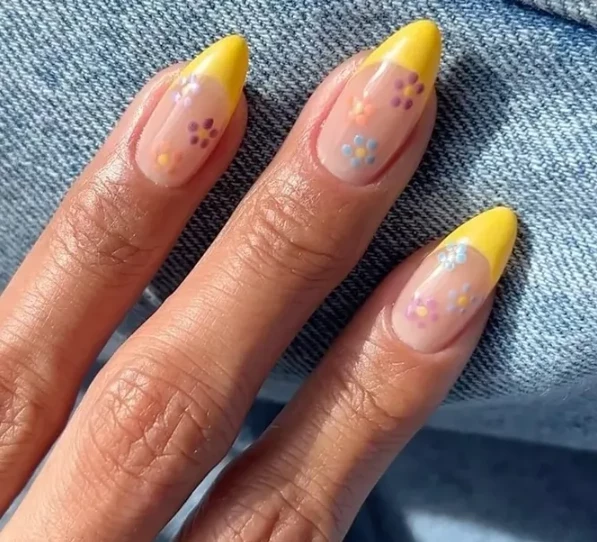 Цветочный принт — одна из самых простых, но в то же время стильных добавок. Для создания такого дизайна можно использовать обычную шпильку, чтобы рисовать маленькие цветочки на желтых кончиках. Это придаст маникюру свежести и легкости.