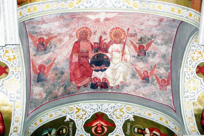 Доподлинно известно и установлено рестовраторами, что в ХVII в. собор был украшен фресковой росписью, т.е. росписью по сырой штукатурке. Сюжеты росписи – это сцены библейской и евангельской истории. К счастью одну из таких фресок сохранилась до нашего времени. Она расположена в месте, где паникадило (церковная люстра) крепится к потолку. На фреске представлена христианская Троица: Бог-Отец и Бог-Сын восседают на небесном престоле, а над ними – Бог-Дух Святой в виде белого голубя.