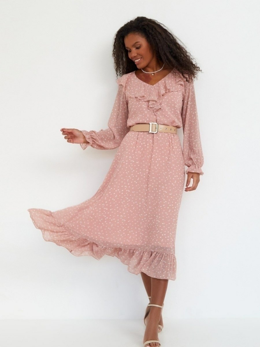 - Женственное платье из шифона классической длины миди и традиционного А-силуэта. Оборка по линии горловины и пышные воздушные рукава добавляют модели романтичности. Широкий V-образный вырез позволяет надеть любое украшение на шею, благодаря этому платье можно порекомендовать и для торжественных выходов.