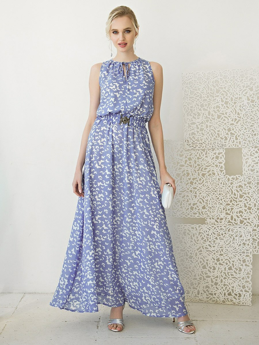 - Летнее платье без рукавов, сшита модель из легкого шифона светло-синего цвета с белым принтом. Лиф свободных с американской проймой, юбка расклешенная длиной до линии щиколотки. Талию подчеркивает пояс на резинки, сшитый из ткани платья.