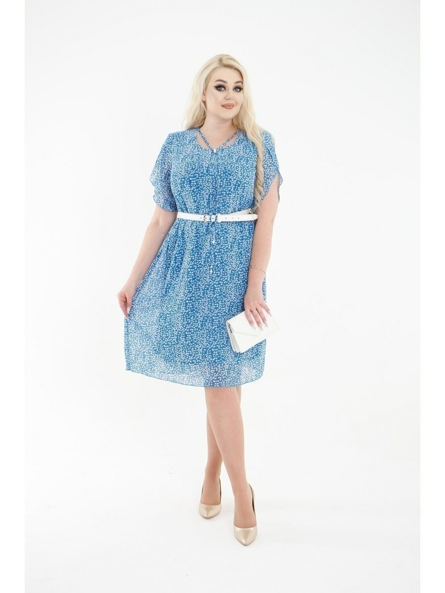 - Простой и стильное платье из воздушного шифона голубого цвета с мелким принтом. Модель силуэта трапеция, носить его можно с поясом и без него. Рукава короткие, свободные. Внимание привлекает необычно оформленный вырез платья. Длина модели – чуть ниже колена.