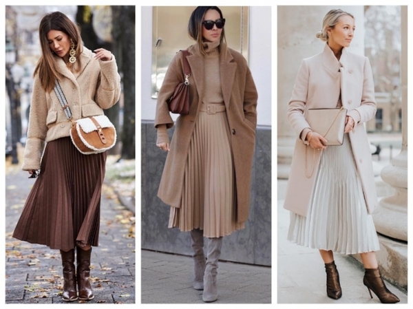 Для холодной погоды подойдет юбка-плиссе из натуральных материалов. В моде будут варианты в различных стилях — как с мелким плиссе, так и с более крупными складками. С модной плиссированной юбкой образ получается женственным и нежным даже в самые непогожие дни.
