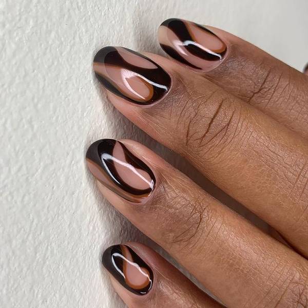 Шоколадный маникюр на овальных ногтях средней длины