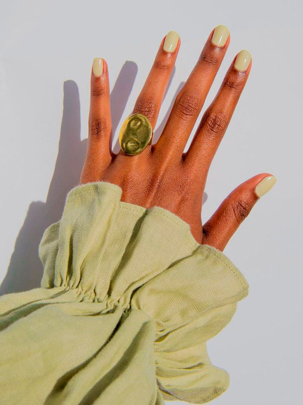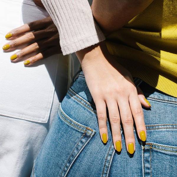 Маникюр горчичного цвета на овальных ногтях средней длины