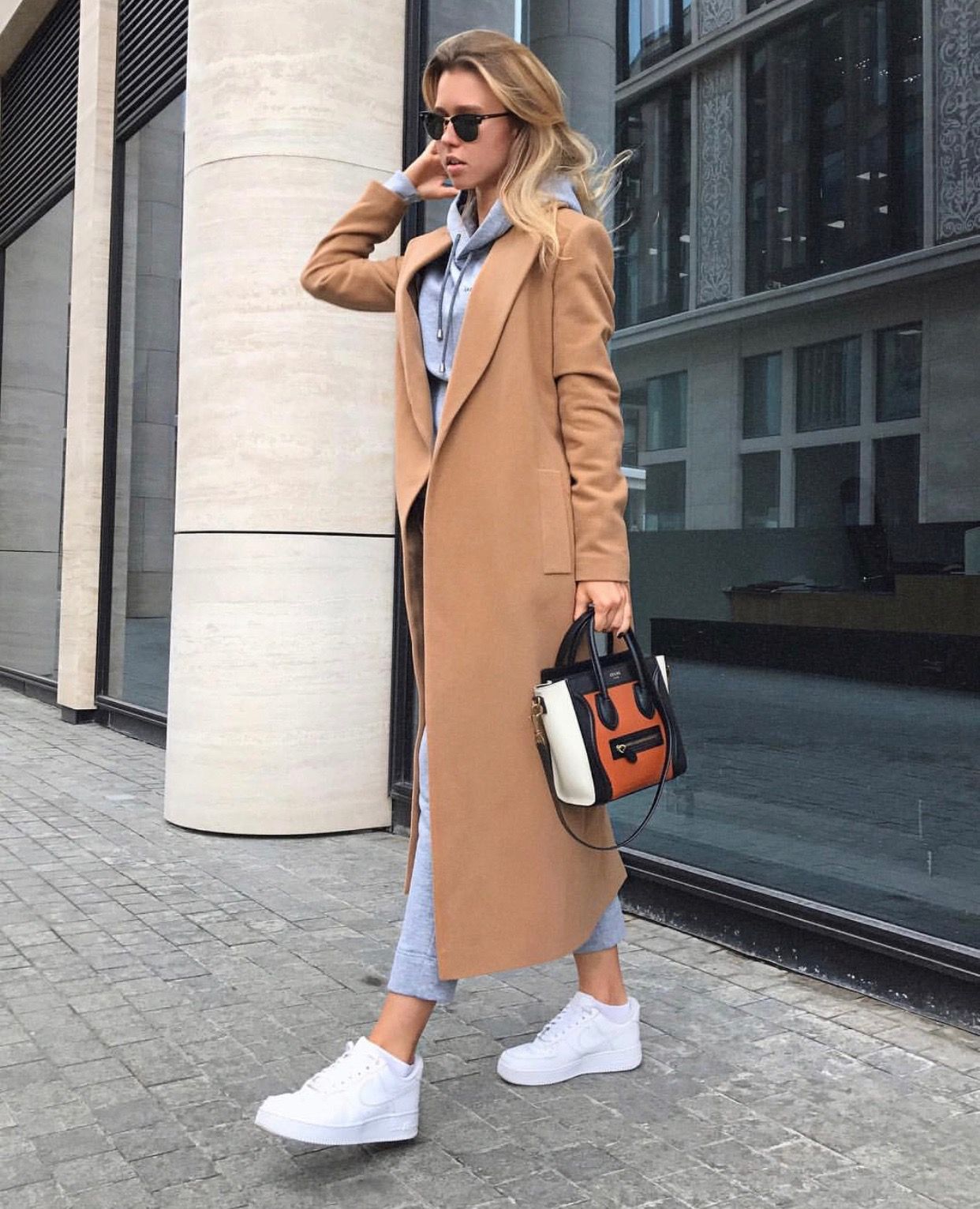 Эта комбинация одна из самых удачных. Пальто любого фасона отлично сочетается с кроссами. При этом не обязательно быть в брюках или джинсах. Современная мода показывает, что кроссовки можно сочетать с юбками и платьями.